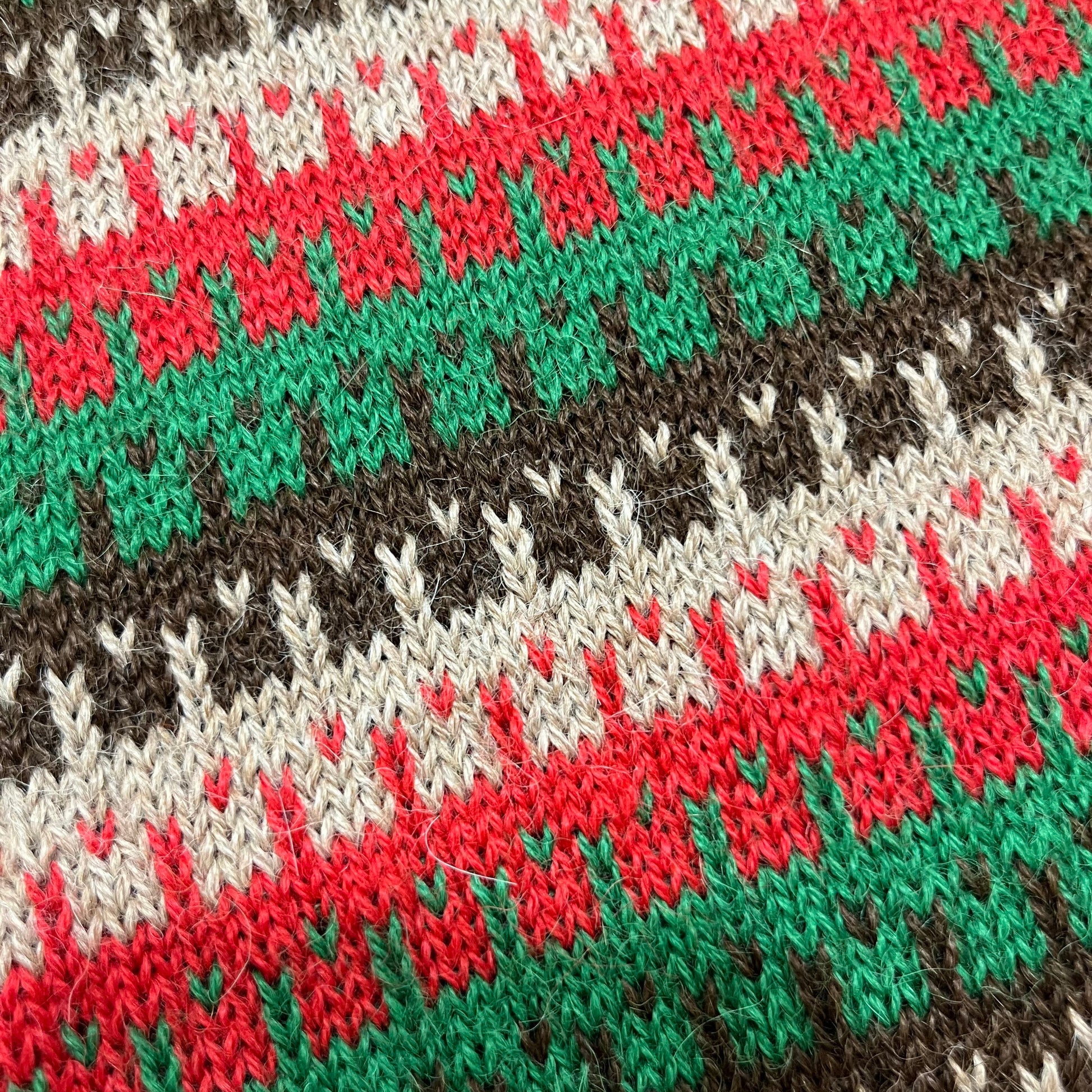 裾、アーム、ネックにリブ編みを施しております。暖色でまとめた幾何学模様が印象的です。差し色として、コーディネイトを楽しめるアイテムです。